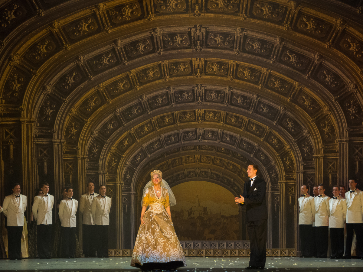 Fidèles à la technique de mise en abyme utilisée par Shakespeare (un lord engage une troupe pour jouer la Mégère et mystifier un pauvre ivrogne), les librettistes Bella et Samuel Spewack plongent le spectateur dans les coulisses de la création d’une adaptation musicale de la Mégère réunissant Fred Graham et Lili Vanessi, un ex-couple de stars, dont les relations orageuses sur scène sont le reflet de leurs chamailleries dans la vraie vie. Côté coulisses, le vaudeville dans les loges du théâtre se mélange à la fantaisie policière avec l’incursion de deux gangsters loufoques (évoquant irrésistiblement Laurel et Hardy) dans l’intrigue et aux numéros de music-hall mettant en scène la vie de la troupe. Côté scène, l’adaptation de la Mégère a de faux airs d’opérette sur fond de carte postale rétro d’Italie, tout en laissant la part belle au matériel théâtral originel. Un mélange improbable qui s’avère pourtant très digeste. La mise en scène de Lee Blakeley, un habitué du Châtelet pour lequel il travaille régulièrement, passe avec élégance et fluidité d’un univers à l’autre, et comme d’habitude dans cette salle de spectacle, on apprécie le soin apporté à l’ensemble de la production, des décors aux costumes, une promesse d’évasion garantie pour le spectateur.