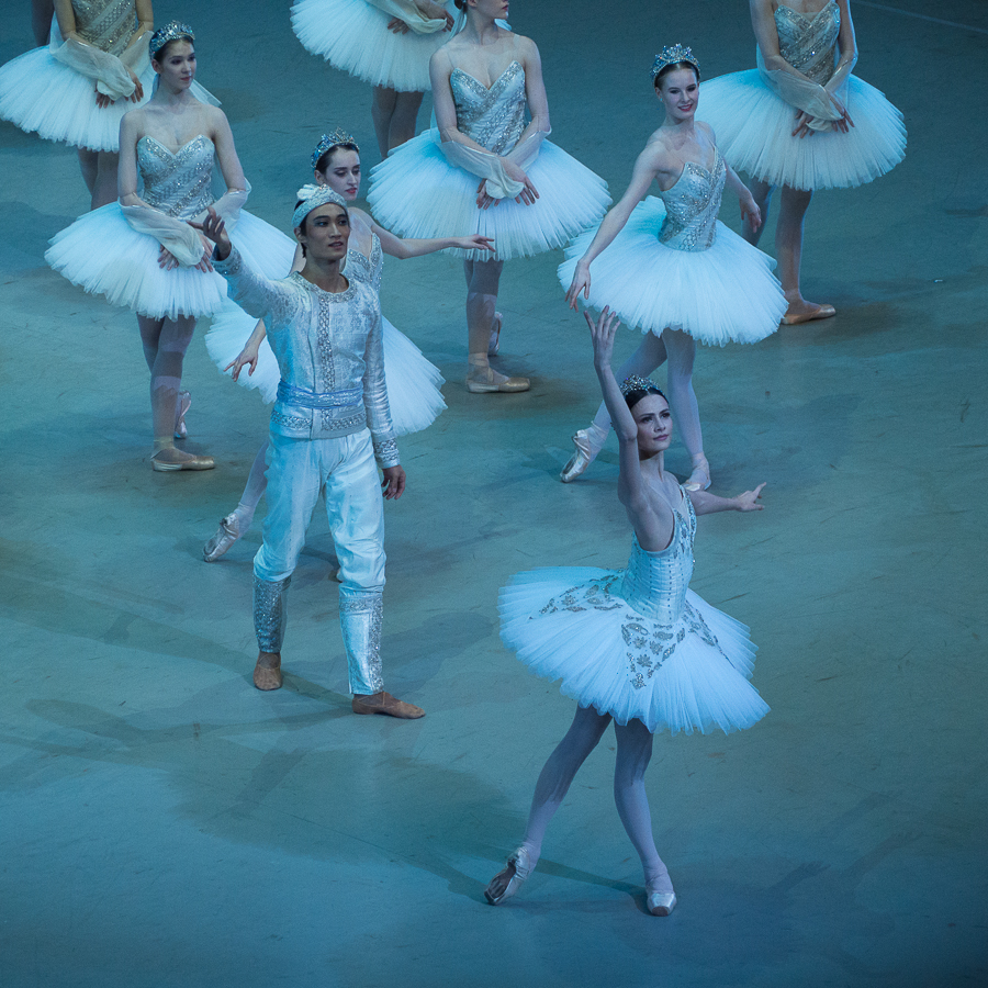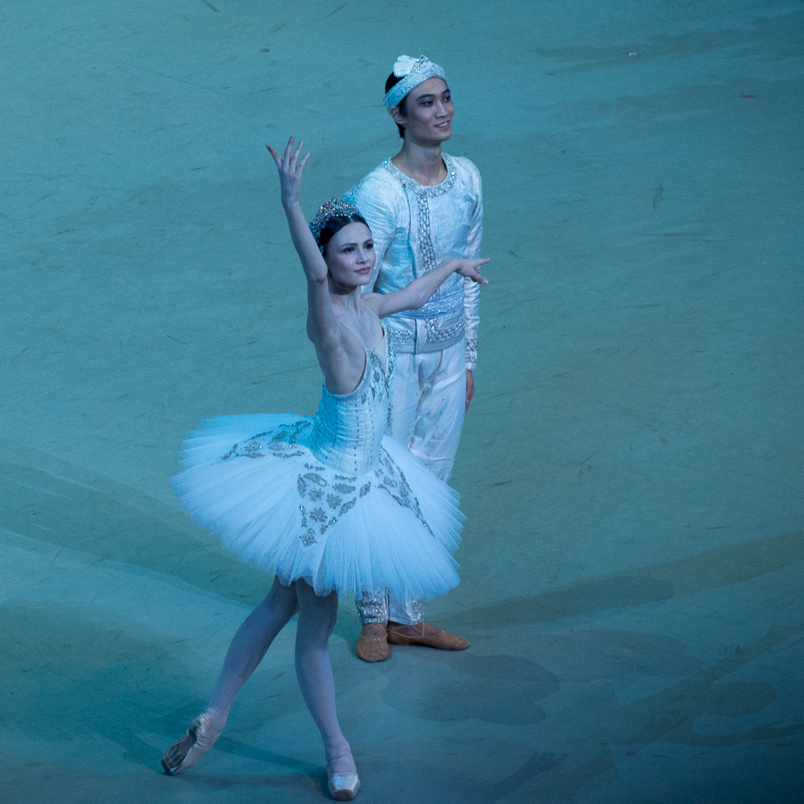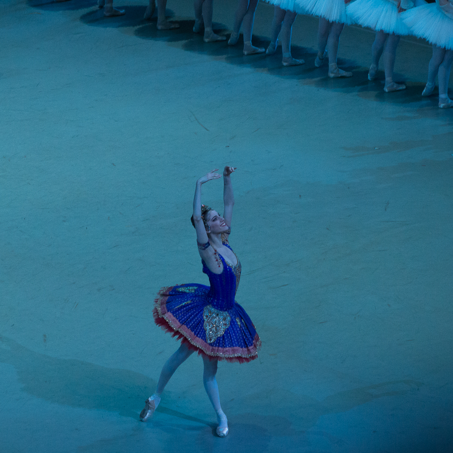Le 3ème acte est finalement un peu phagocyté sur le plan émotionnel par le Solor hors norme de Kim Kimin : l’image qui reste en mémoire, c’est ce manège de double-assemblés vertigineux exécuté avec une fluidité désarmante. C’est Solor, pourtant bien humain, qui semble planer alors que le fantôme de Nikiya est rattrapé par les lois de la pesanteur. Kristina Shapran n’a pas la vitesse d’exécution d’une Svetlana Zakharova ou d’une Dorothée Gilbert qui conférerait légereté d’une plume et évanescence à sa Nikiya, et, si les pas de deux sont superbement exécutés, je n’y ai pas ressenti la fusion de deux âmes.