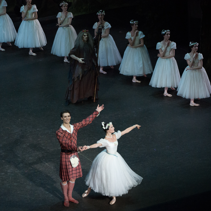 Dans le 1er acte dont la scénographie joue à fond la carte du pittoresque écossais, cher à Walter Scott, il est au centre de toutes les attentions. Alors qu’il sommeille devant l’âtre de la cheminée, une curieuse créature, fantasme ou réalité, fait irruption dans le logis. La Sylphide charme le jeune homme et lui subtilise la bague destinée à sa fiancée, Effie. Cette intrigue principale est diluée dans une suite de divertissements écossais, célébrant la future union de James et Effie. J’avoue trouver parfois un peu longuets ces exercices de virtuosité pure, avec une scène trop encombrée pour que le corps de ballet donne sa pleine mesure. C’est néanmoins l’occasion d’admirer dans le pas des deux des Ecossais, Emmanuel Thibault, un des plus beaux stylistes de l’Opéra, qui termine sa carrière sur cette série, associé à Marion Barbeau, un des grands espoirs de la classe des sujets.