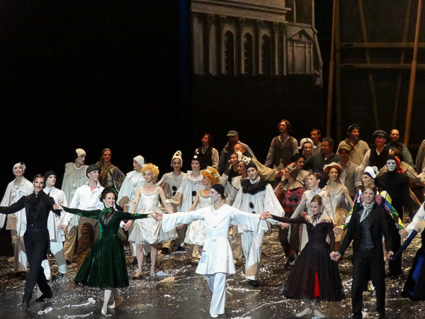 Il a choisi le parti pris ambitieux de recréer le temps d’une soirée dans l’enceinte de l’Opéra Garnier cet univers fantasmé du monde du spectacle. Dès le grand escalier, le spectateur est accueilli par musiciens, jongleurs et funambules qui prennent la pause avec lui pour une photographie souvenir, l’apostrophent ou l’invitent à rejoindre la salle. La scénographie est une réussite visuelle: on est sans doute plus proche du Technicolor flamboyant du French Cancan de Jean Renoir que du noir et blanc poétique de Marcel Carné mais les décors d’Ezzio Toffolutti et les costumes d’Agnès Letestu recréent la magie de ce Paris du spectacle disparu avec le joyeux chaos du boulevard du Temple, ses théâtres plus ou moins prestigieux, côté scène et côté coulisses, ses pensions miteuses avec leurs petites chambres et leurs logeuses, le cabaret enfumé avec son bal populaire, l’univers plus feutré des aristocrates qui s’encanaillent avec les artistes. Cette reconstitution soigneuse, la construction du ballet calquée scrupuleusement sur le synopsis du film et la composition passe-partout de Marc-Olivier Dupin étouffent cependant le côté vivant du spectacle. On imagine ce que le talent de conteur d’un Roland Petit aurait pu faire de cet argument, lui qui a travaillé avec une partie des collaborateurs de Marcel Carné (Jacques Prévert, le peintre et costumier Mayo , Joseph Kosma), tenants du réalisme poétique dont son Rendez-Vous est un superbe exemple .