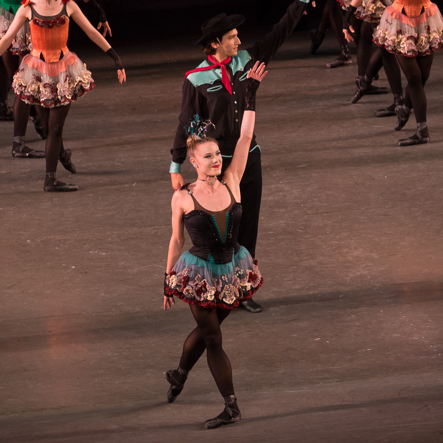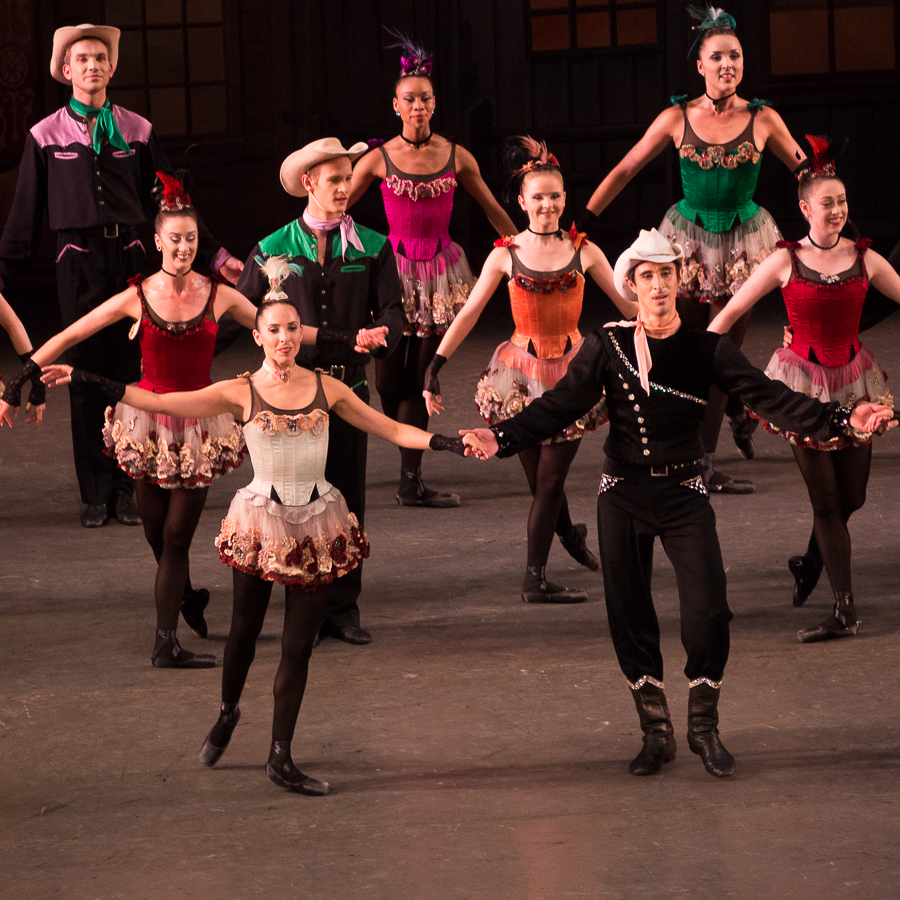 Western Symphony est une pièce qui pourrait paraître kitsch au premier abord avec ses airs folkloriques entraînants, son décor figurant une rue du Far West, ses cowboys et ses girls de saloon. Balanchine s’approprie la mythologie de l’Ouest américain et construit sur cette trame un ballet de facture classique, comme lorsqu’il rend hommage aux maitres européens dans Symphony in C ou Tchaïkovski Piano Concerto n°2.