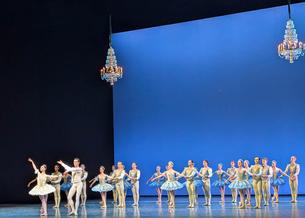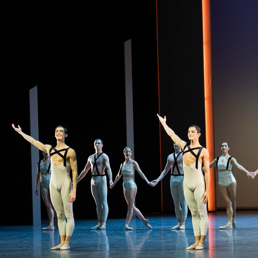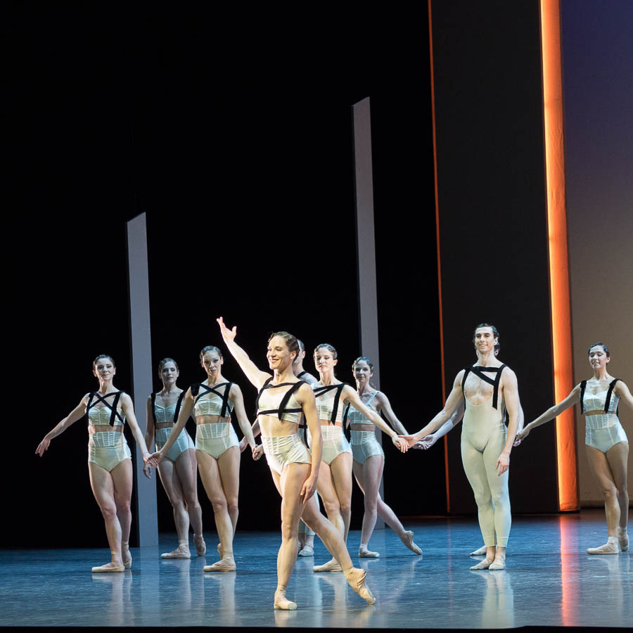 Thème et Variations a été créé en 1947 pour l’American Ballet puis revue pour le New York City Ballet en 1960. La pièce est entrée au répertoire parisien en 1993, et la dernière reprise remonte à 2016. Sur la partition du dernier mouvement de la 3ème suite pour orchestre de Tchaïkovski, son compositeur préféré, Balanchine offre un manifeste du classicisme dans toute sa gloire, un hommage à la Russie impériale et à Marius Petipa. Thème et Variations est une œuvre empreinte de la nostalgie du chorégraphe pour sa culture russe mais aussi de l’énergie de l’exilé à la conquête du nouveau monde. Le ballet s’ouvre sur une sorte d’abécédaire de la danse classique avec des pas très simples qui va ensuite se développer en harmonie avec la musique en un grand pas de deux pour clôturer sur une polonaise typiquement russe, le tout pimenté d’une approche jazzy.