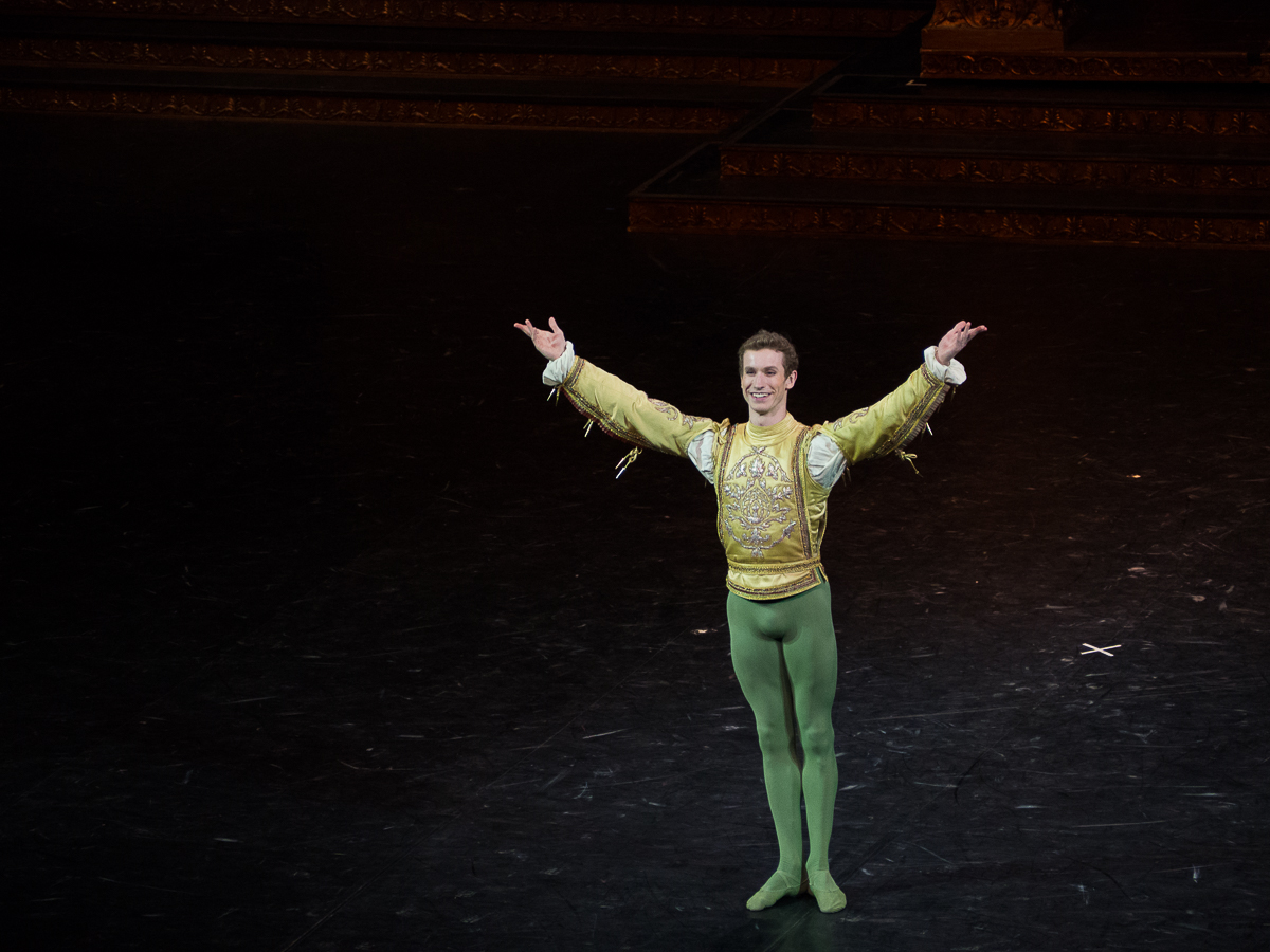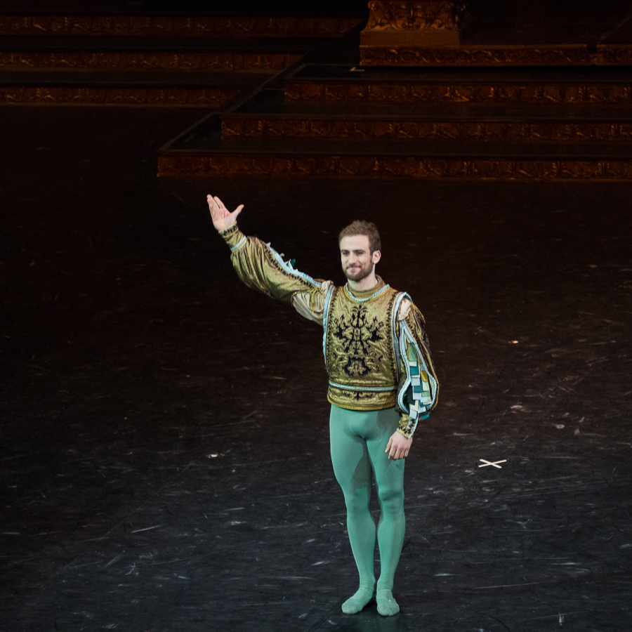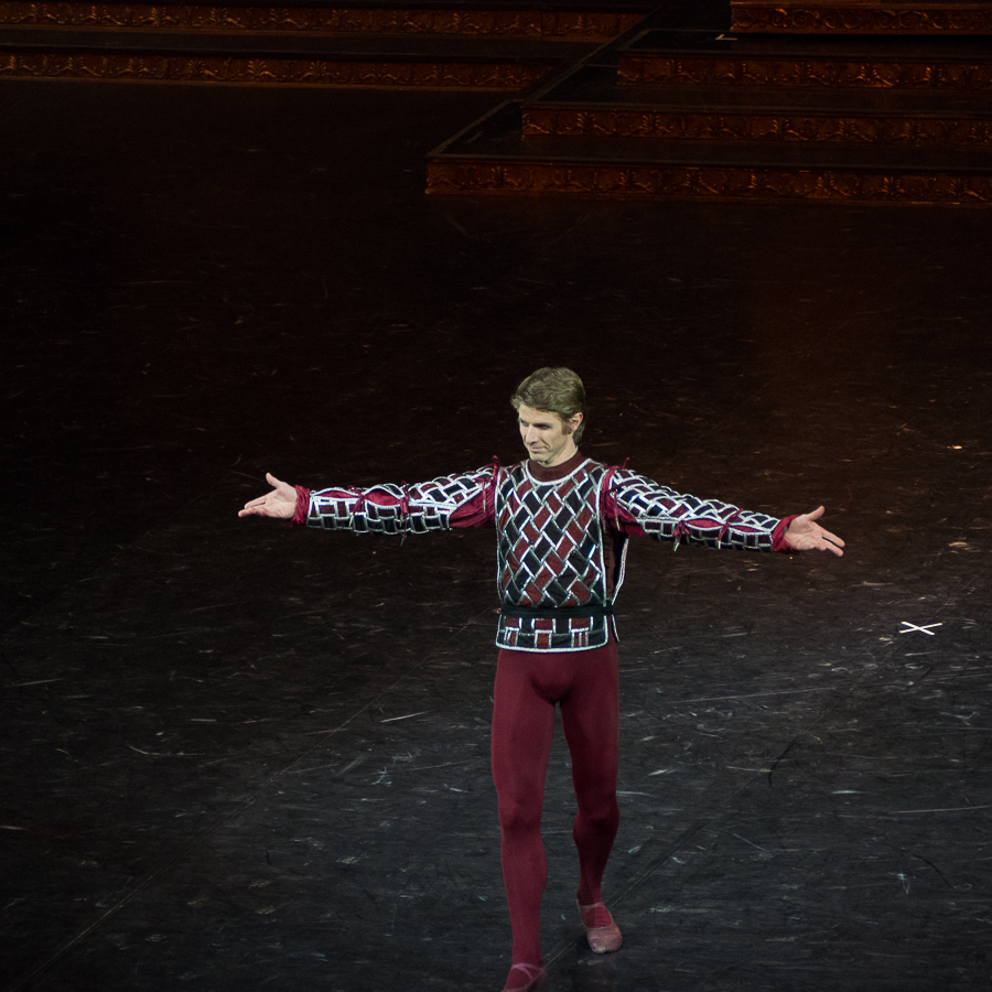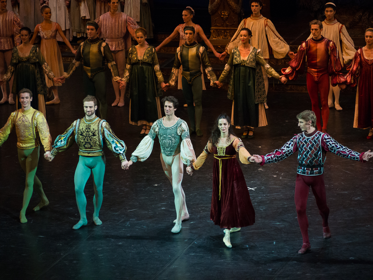 Portrait d’une jeune femme forte, Roméo et Juliette est aussi assez paradoxalement un ballet mettant en valeur la danse masculine dans ses différents styles. Si l’ on excepte les rôles de caractère de la nourrice et de Lady Capulet et la Rosaline d’Heloïse Bourdon, archétype de la coquette, Amandine Albisson a fort à faire sur le plateau pour exister face aux hommes de Vérone. François Alu est un Mercutio prodigieux: comme à son habitude, il dévore la scène, et son solo du premier acte, petit bijou d’explosivité et d’humour, déclenche l’enthousiasme du public. Dans le clan Montaigu, le Benvolio de Fabien Révillion allie puissance des sauts et élégance des lignes dans sa danse. Le trio Roméo – Mercutio – Benvolio fonctionne particulièrement bien et nous offre les temps forts du ballet, notamment dans le deuxième acte. Karl Paquette apporte sa finesse dramatique au personnage de Tybalt, un rôle compliqué puisqu’il doit pouvoir osciller entre la tendresse de l’amour fraternel et protecteur qu’il porte à Juliette, l’autorité du bras armé de la famille Capulet et la brutalité soldatesque des rixes dans les ruelles de Vérone. Il me semble néanmoins manquer un peu d’impact physique dans la spectaculaire danse des chevaliers du premier acte ou dans le duel de l’acte II qui précède sa mort des mains de Roméo. On aurait aimé un Pâris avec plus de panache, mais le côté appliqué de Yann Chailloux sied finalement assez bien au rôle dévolu au promis de Juliette. Le corps de ballet était plutôt bien en place pour une première, et il ne manquait qu’une petite étincelle entre les deux protagonistes principaux pour sublimer la représentation.