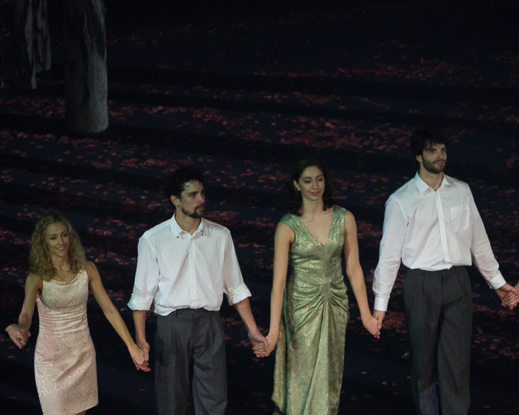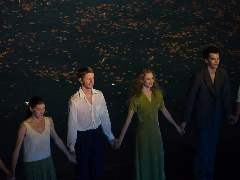 Dans Die Grosse Fuge, dans un dispositif scénique relativement similaire, ce sont à présent 8 jeunes cadres, 7 hommes et 1 femme, en costume noir et chemise blanche, qui évacuent leur stress dans une série quasi ininterrompue de roulés-boulés spectaculaires. La partition de Beethoven (plus accessible que le quatuor de Bartók) et le dynamisme de la chorégraphie réveillent le spectateur. On retrouve avec plaisir des danseurs qui sont un peu oubliés depuis le début de l’ère Millepied, Alice Renavand, Stéphane Bullion, Florian Magnenet et Vincent Chaillet. Ils se mettent avec humilité au service d’une chorégraphie où le danseur n’est pas mis en avant par la spécificité des pas et des figures qui lui sont confiés mais par la façon qui lui est propre d’exécuter le même mouvement que son voisin, en l’occurrence ici les fameuses chutes/roulades au sol.