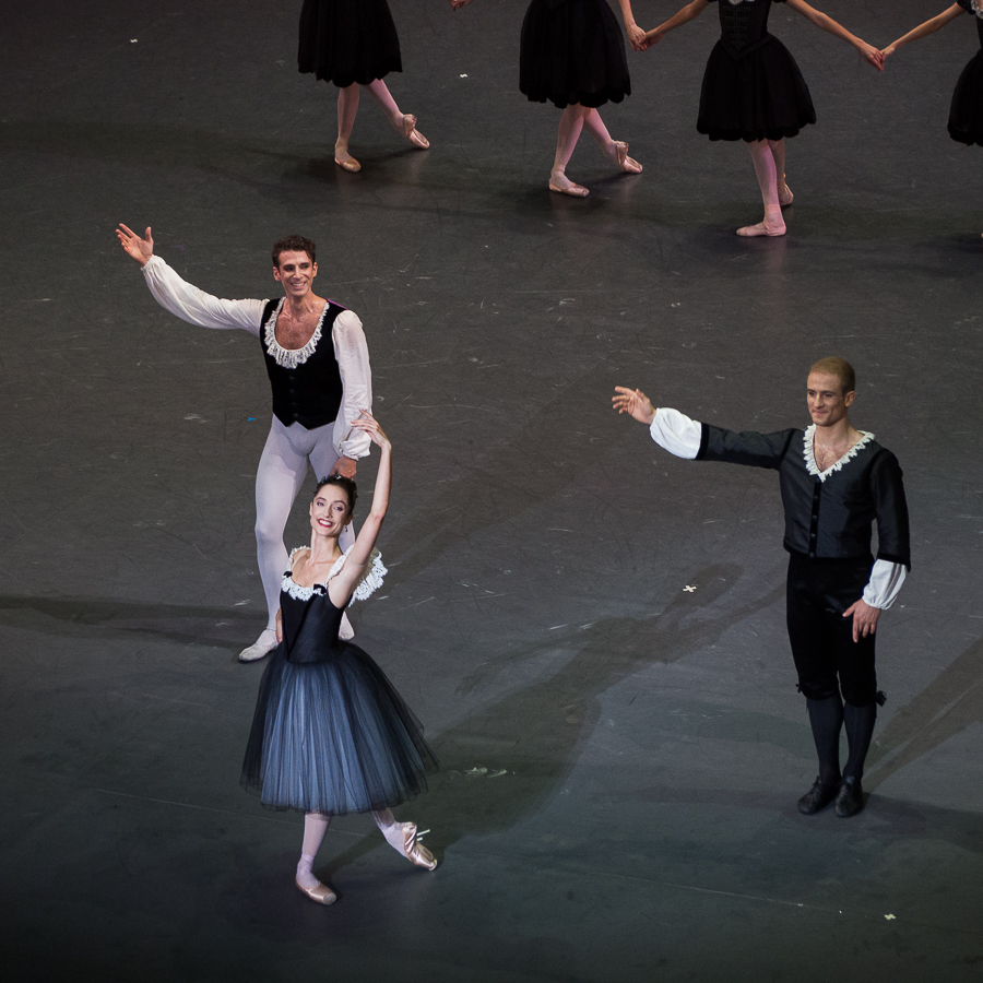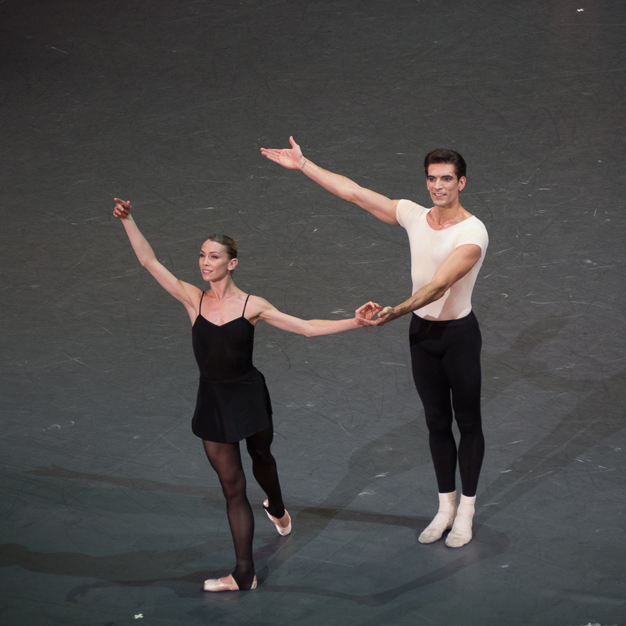 La soirée se concluait de façon étonnante par le ballet le plus exigeant pour le spectateur. Violin Concerto fait partie de la veine Black and White de Balanchine, celle de Agon ou encore Duo Concertant, s’appuyant sur les compositions musicales de Stravinsky. J’avoue être généralement un peu décontenancée par ces ballets, notamment parce que la musique de Stravinsky n’est pas forcément facile à apprécier à la première écoute pour le béotien, et ce soir, cela a fonctionné instantanément pour moi grâce aux deux couples qui se partagent les 2 pas de deux centraux de la pièce, Marie-Agnès Gillot, qui a retrouvé tous ses moyens, associée à Hugo Marchand, presqu’une étoile déjà, et surtout Eleonara Abbagnato et Audric Bezard dont la théâtralité dépasse le cadre a priori abstrait du ballet. Dans le Capriccio conclusif où le chorégraphe mélange les influences du folklore de sa Russie natale à des éléments plus jazzy, ils sont rejoints par un corps de ballet joueur au diapason de ses solistes, très chaleureusement applaudis par un public bien discret jusque là.