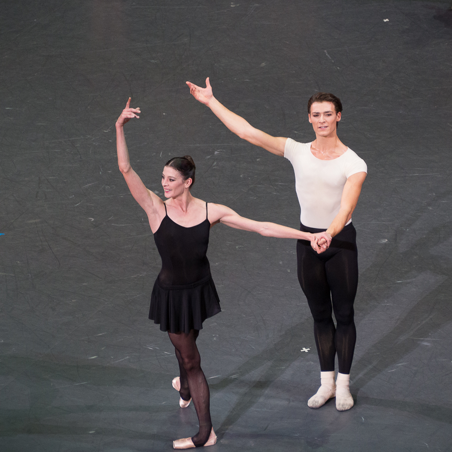 Sonatine, pas de deux sur la pièce éponyme de Ravel que Balanchine créa en 1975 pour deux étoiles françaises du New York City Ballet, Violette Verdy, disparue début 2016 et à laquelle la soirée était dédiée, et Jean-Pierre Bonnefoux, était ensuite repris par le magnifique duo Myriam Ould-Braham / Mathias Heymann. Un beau moment que cette parade amoureuse autour du piano d’Elena Bonnay où Myriam Ould-Braham révèle une certaine sensualité qu’on ne lui connaissait pas forcément face à Mathias Heymann à la fois timide dans l’interprétation et éblouissant dans sa danse.