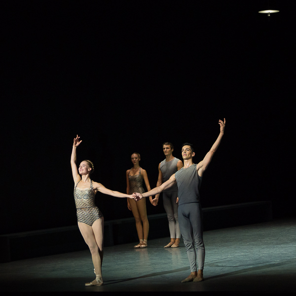 Thème et Variations est la pièce virtuose idéale pour terminer une soirée de gala. Redoutable défi pour les deux premiers danseurs Valentine Colasante et François Alu, dans leurs habits parés d’or, exposés sans filet à des difficultés techniques qui montent crescendo. On les sent parfois un peu fébriles dans leur partenariat (et les mauvaises habitudes corrigées en répétition reviennent au galop) mais j’ai aimé le cran avec lequel ils ont abordé leurs morceaux de bravoure respectifs avec un petit air de bravade. C’est une reconnaissance de la part de Benjamin Millepied de leur avoir confié ces rôles, ce qui les place de fait tout en haut de la pyramide du ballet pour leur maestria technique. On peut néanmoins penser que la personnalité de François Alu est un peu bridée dans ce registre, le fait d’une volonté de dompter le pur-sang? La polonaise qui conclut la pièce, avec son corps de ballet déjà bien réglé, laisse augurer une saison sous le signe du plaisir de danser.