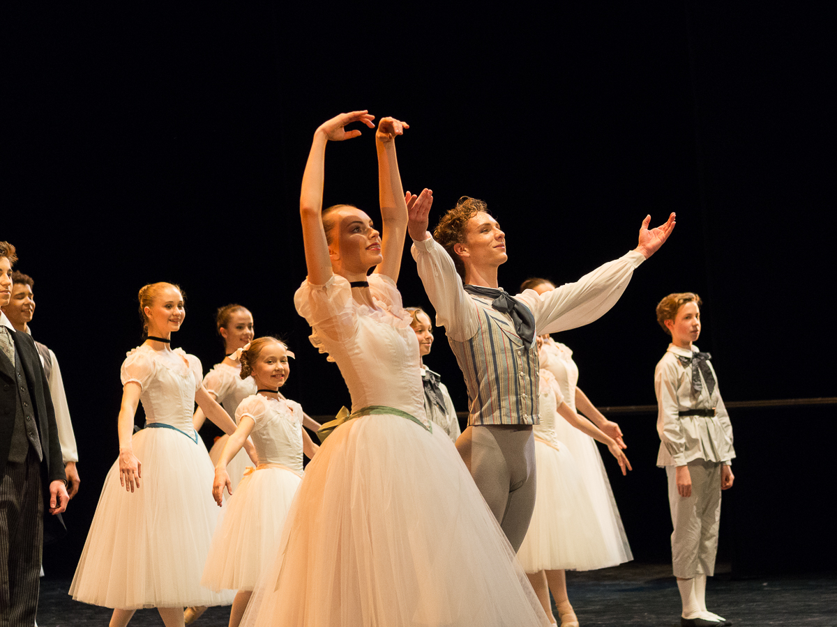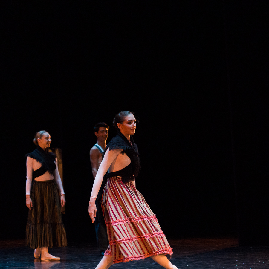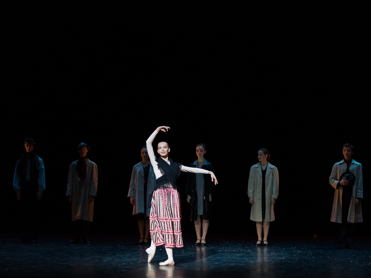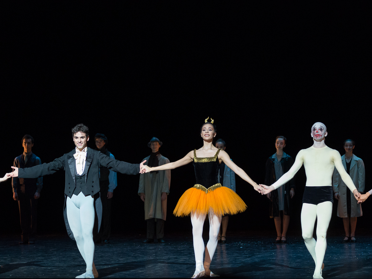 Avec Les Forains, on fait un bond dans le temps de près d’un siècle pour retrouver Roland Petit, autre élève de la maison, et sa théâtralité pour son premier opus de chorégraphe associé à Boris Kochno, une des figures de proue des Ballets Russes, et au décorateur Christian Bérard. Ce ballet est la démonstration éclatante qu’avec un décor très simple, quelques accessoires et des costumes chinés aux puces, on peut faire des miracles et créer une superbe scénographie. A travers ces scènes de la vie d’une troupe de saltimbanques, les jeunes danseurs ont l’occasion d’exprimer leur sensibilité avec des personnages qui ont chacun une petite histoire à raconter. La chorégraphie n’est pas particulièrement complexe, mais particulièrement efficace avec de très beaux tableaux : le pas de deux entre le clown et la petite fille rehaussée par un tabouret, la danse serpentine de Loïe Fuller, le prestidigitateur et les deux colombes, autant de moments qui distillent la magie du spectacle.