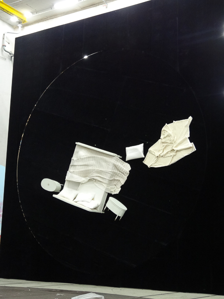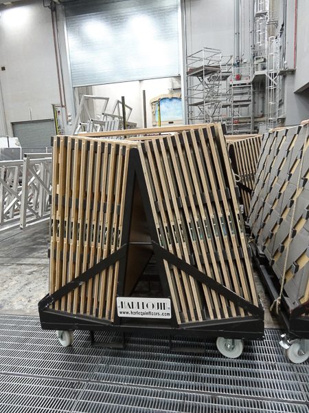 Ces décors transiteront par le monte-charge géant qui relie le 6ème sous-sol, à 25 mètres sous terre, et la scène. C’est dans ce sous-sol que nous découvrons le plancher de danse Harlequin qui sera installé pour l’Anatomie de la Sensation, le dernier ballet de la saison. On apprend au passage quelques anecdotes sur les impacts du changement de direction: l’arrivée de Stéphane Lissner a développé les échanges avec la Scala de Milan, dont Paris devrait récupérer un certain nombre de productions, Benjamin Millepied est très exigeant sur la qualité du lino qui recouvre le plancher de danse (il doit être fabriqué par une firme américaine et être de couleur gris anthracite). Sont également évoqués quelques souvenirs des tournées avec le ballet et de l’incroyable efficacité des Japonais pour mettre en place les décors de la Bayadère, des décors des productions Noureev qui nécessitent un sérieux rafraîchissement.